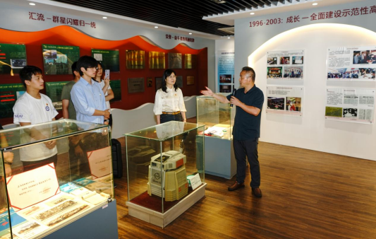 线下会议在学校校史馆举行,通过现场直播到线上腾讯会议平台。首先在董俊华校友带领下一起参观了校史馆,他指着一张张照片,回忆起了当年的学校领导、老师、同学、同事、校门、操场、用过的的教材、熟悉的实验室,介绍了学校一代代电机人心怀理想、脚踏实地、不畏艰辛、攻坚克难,传承“明德至善、博学笃行”的信念与梦想,书写“技术立校、应用为本”的荣耀与辉煌。