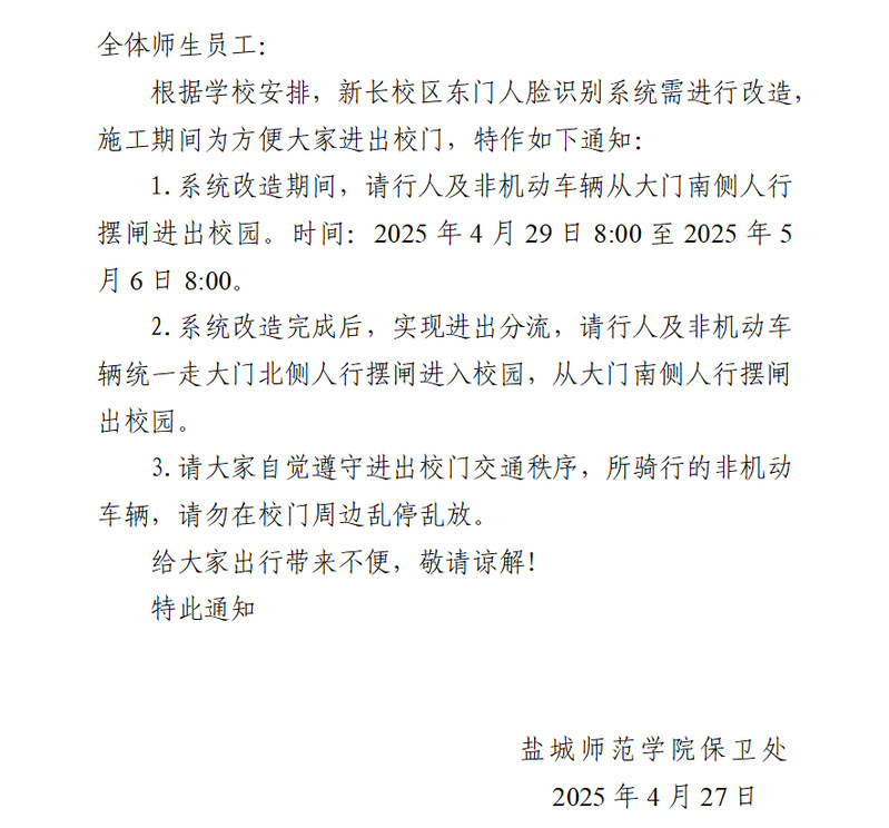 关于新长校区东门人脸识别系统改造期间人员进出校园的通知