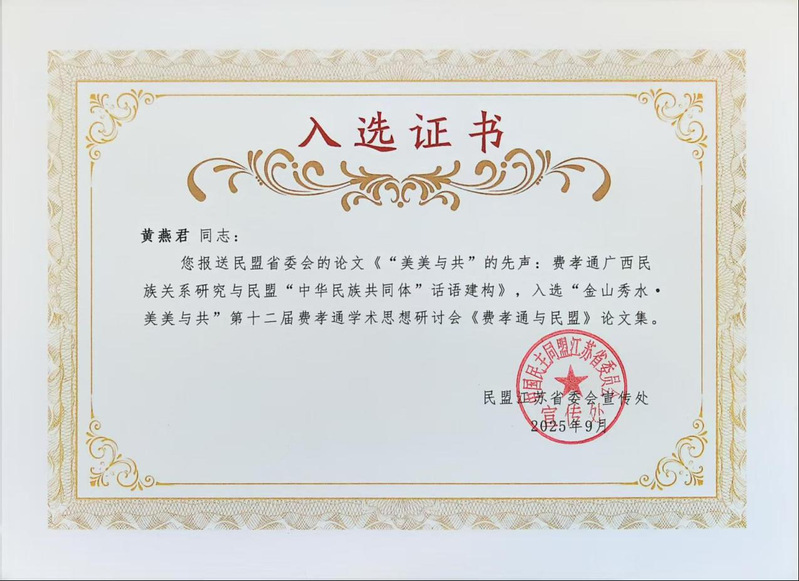 黄燕君博士作为新盟员,自2024年11月加入校民盟基层委员会以来,持续深耕文化研究与统战理论相结合的领域。此前,她撰写的《从地方戏到文化自信:淮剧生态优化对弘扬中华戏曲文化的启示》一文获第十六届民盟文化论坛优秀论文;《“美美与共”的先声:费孝通广西民族关系研究与民盟“中华民族共同体”话语建构》一文入选“金山秀水·美美与共”第十二届费孝通学术思想研讨会《费孝通与民盟》论文集。